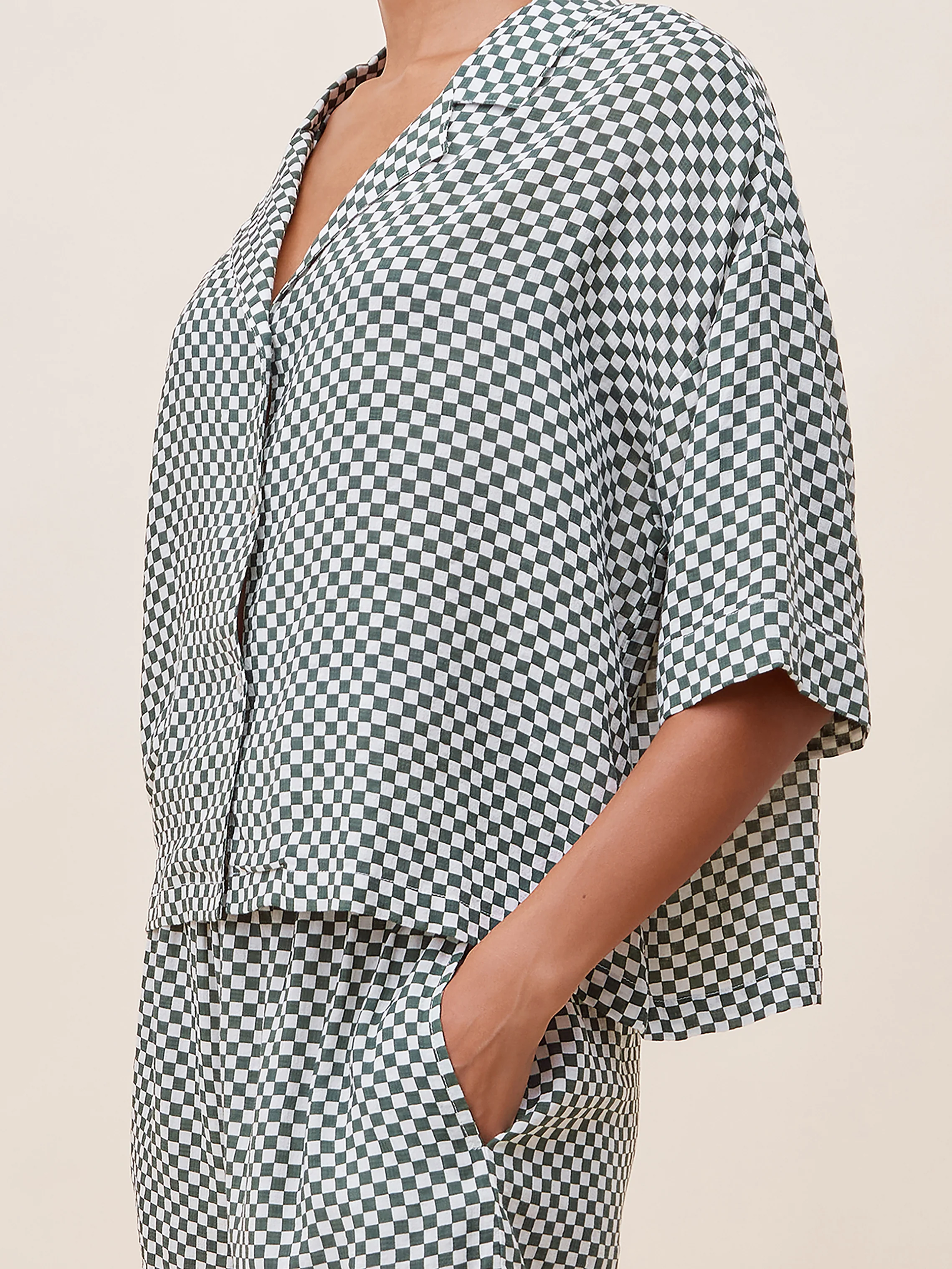 A soft boxer PJ set made from breathable a cotton & Lenzing™ Ecovero™ Viscose in a French girl chic check print.
