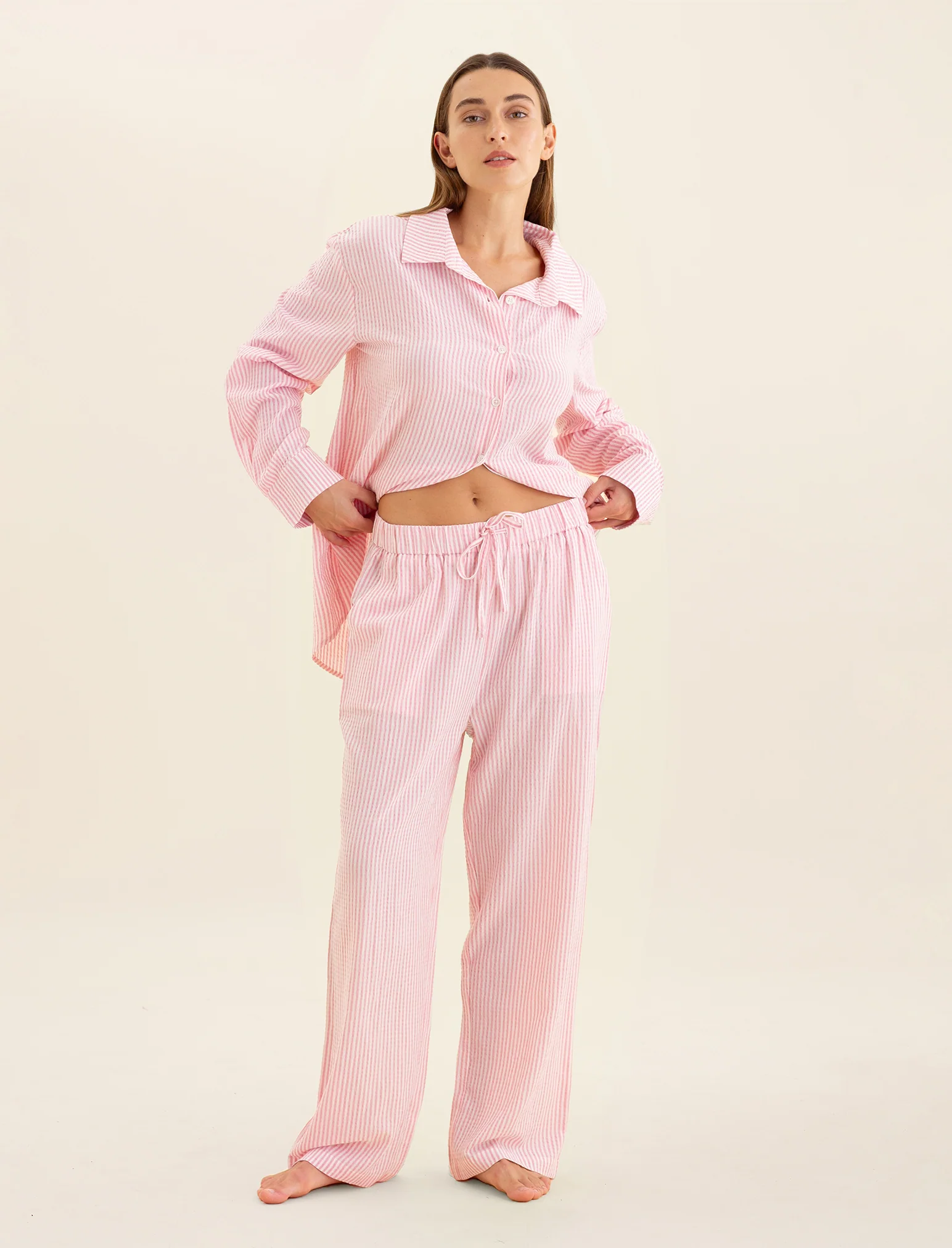 Our beautiful, relaxed, full-length pants are made from a blend of 50% Cotton and 50% certified Lenzing™ Ecovero™ Viscose, making them breathable and lightweight. The classic rose, stripe print is perfect for all year around! Pair me with our classic Milla tanks or any seasonal separates!